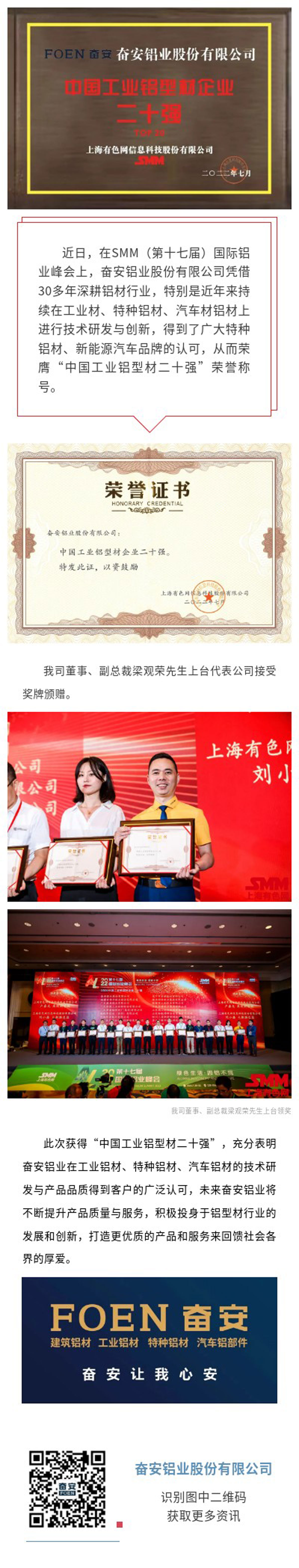喜訊 | 奮安鋁業(yè)榮膺中國工業(yè)鋁型材企業(yè)二十強