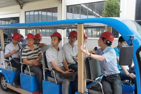 地產(chǎn)采購經(jīng)理人在觀光車上巡視奮安集團(tuán)各個(gè)車間